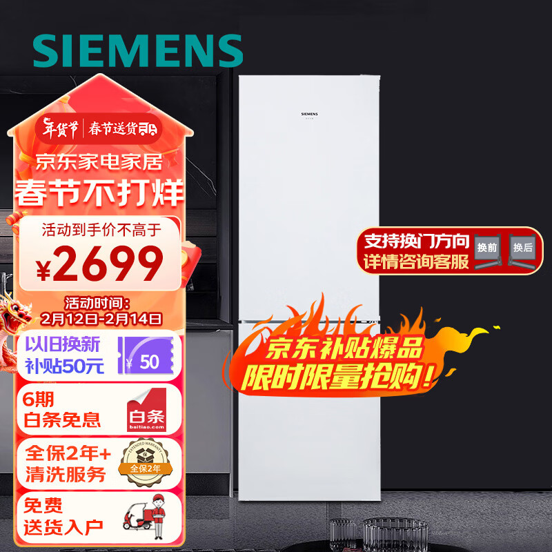 西门子(SIEMENS) 321升风冷无霜双门大容量家用冰箱 双效过滤 超大冷藏 白色 以旧换新(KG32NV21EC)价格:2699.00元!