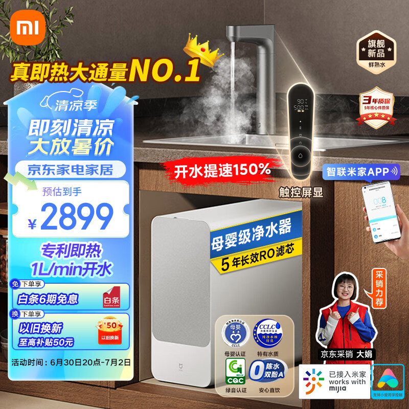 米家【即热旗舰款】厨下加热直饮净水器Q1000G大通量厨下式反渗透直饮机无罐真即热智显玻璃龙头价格:2899.00元!
