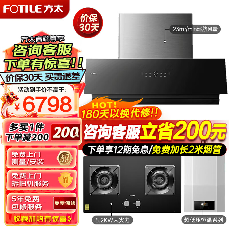 方太(FOTILE)油烟机灶具套装JCD10TB+TH29B家用侧吸式抽油烟机燃气灶具燃气热水器JSQ30-P16T1三件套价格:6798.00元!