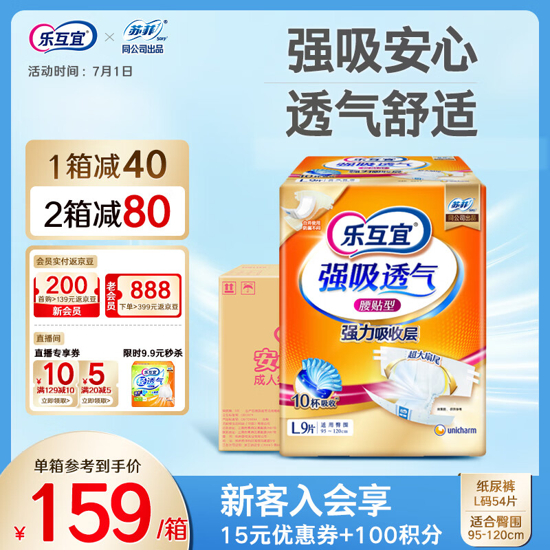 乐互宜强吸透气成人纸尿裤老年人专用腰贴型尿不湿L码箱装54片价格:199.00元!