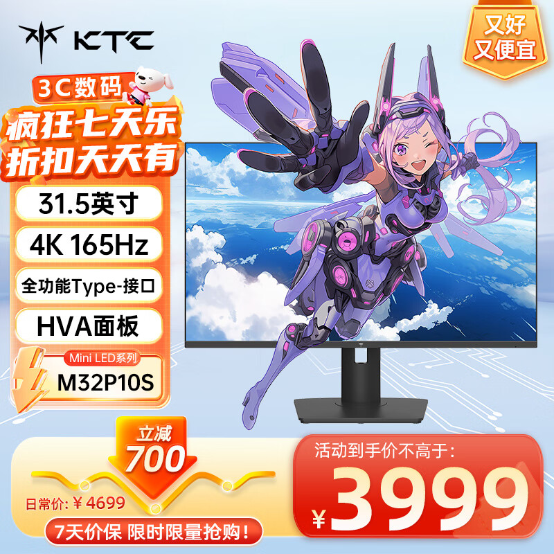 KTC 31.5英寸4K165Hz MiniLED 广色域 10bit 护眼显示屏 4608灯珠旋转升降HDR1000 电脑显示器M32P10S价格:3999.00元!