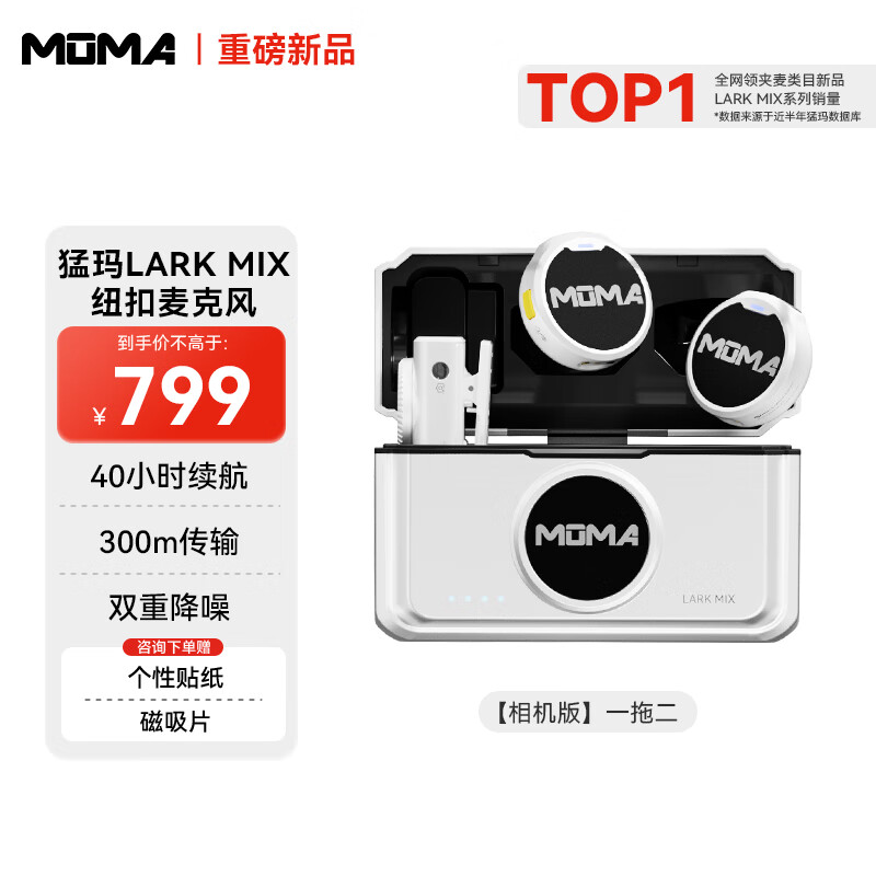 猛玛(MOMA)Lark Mix 一拖二无线领夹麦克风猛犸相机直播vlog户外采访微小型纽扣收音麦相机版白色价格:799.00元!