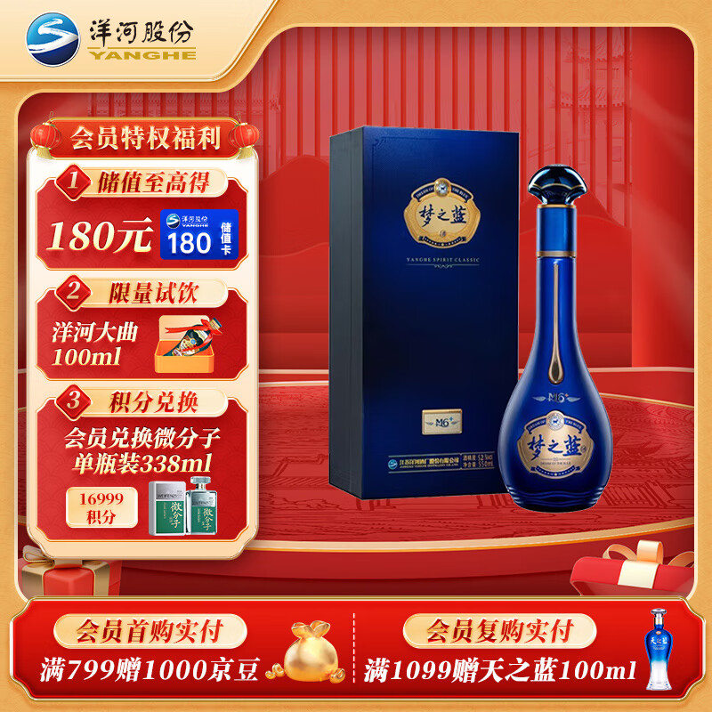 洋河 梦之蓝M6+ 52度 550ml 单瓶装 绵柔浓香型价格:928.00元!