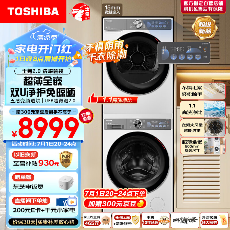 东芝(TOSHIBA)玉兔2.0洗烘套装DG-10T19B+DH-10T19B 超薄全嵌10KG全自动滚筒洗衣机+10KG热泵式变频烘干机除毛絮价格:9299.00元!