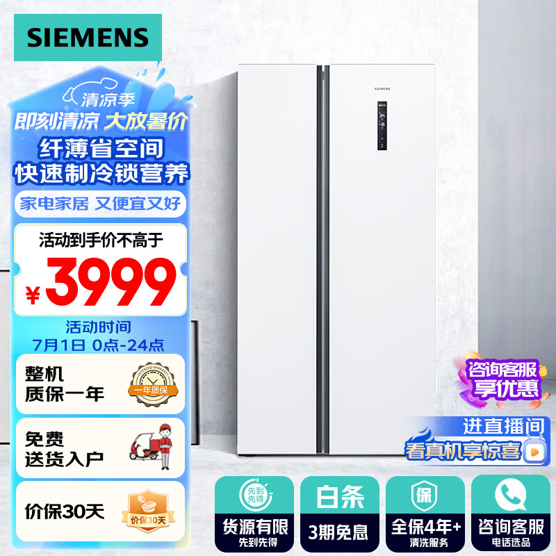 西门子(SIEMENS) 502升变频无霜冰箱双开门对开门家用大容量长效保鲜超薄嵌入白色KA50NE20TI价格:4419.00元!