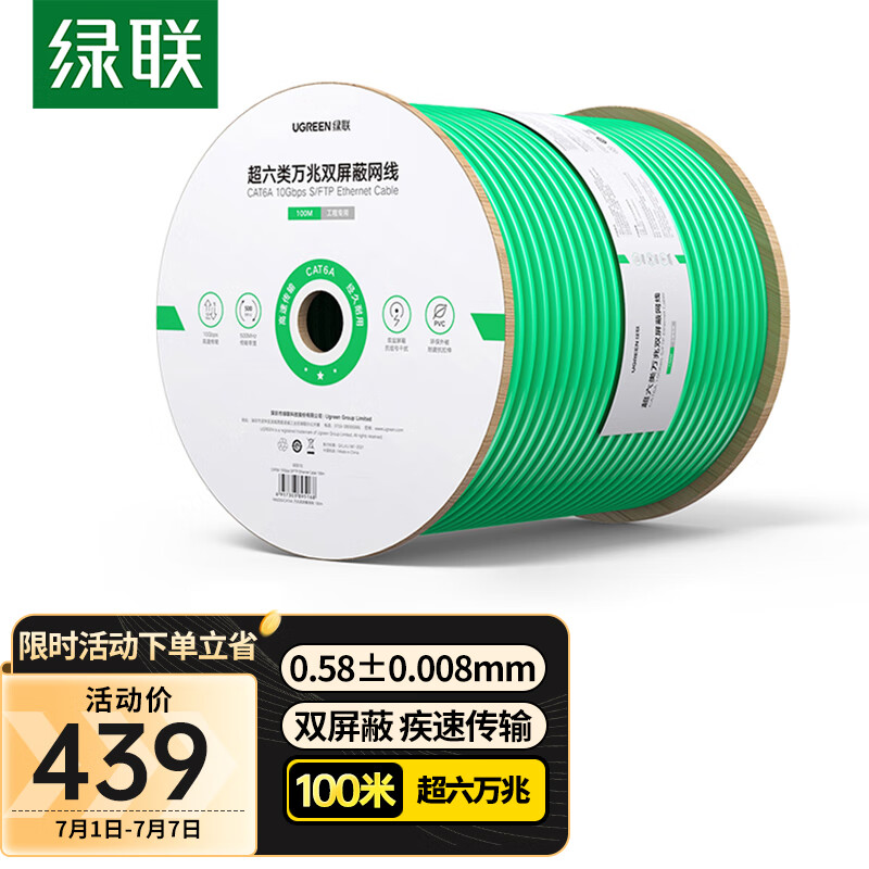 绿联(UGREEN)超六类双屏蔽网线【0.58±0.008mm纯铜线芯】CAT6A万兆抗干扰降衰减 网络POE监控工程家装箱线100米价格:499.00元!