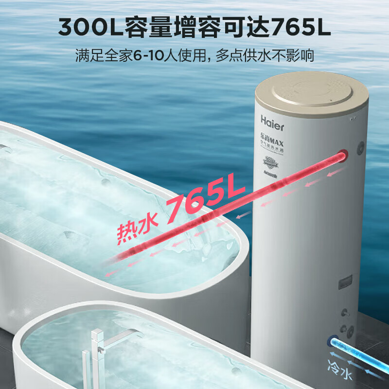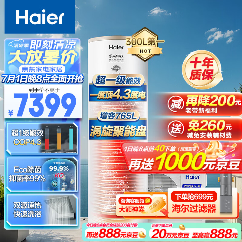 海尔(Haier)空气能热水器300升包安装超一级南北通用电辅80℃净水洗京东小家以旧换新RE-300N5U1(6-10人)价格:7399.00元!