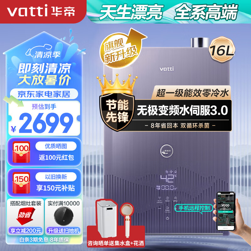 华帝(VATTI)16升燃气热水器天然气 i12254 pro一级能效冷凝式零冷水 水伺服恒温增压浴i12253S-16 以旧换新价格:2699.00元!