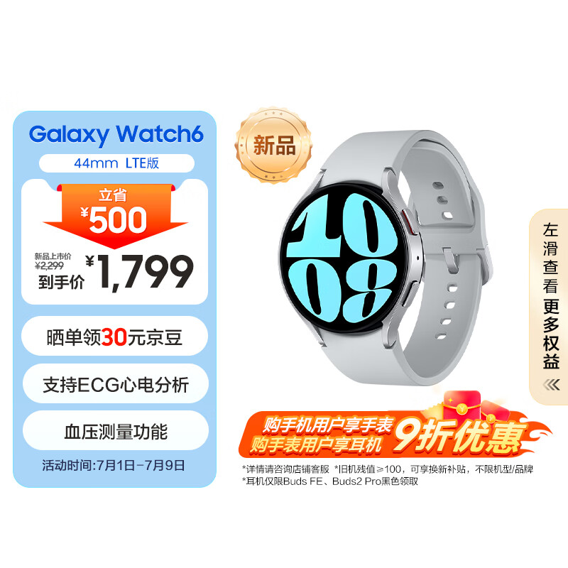 三星Galaxy Watch6 eSIM独立通话/智能手表/运动电话手表/ECG心电分析/血压手表/健康监测 44mm 星系银价格:1799.00元!
