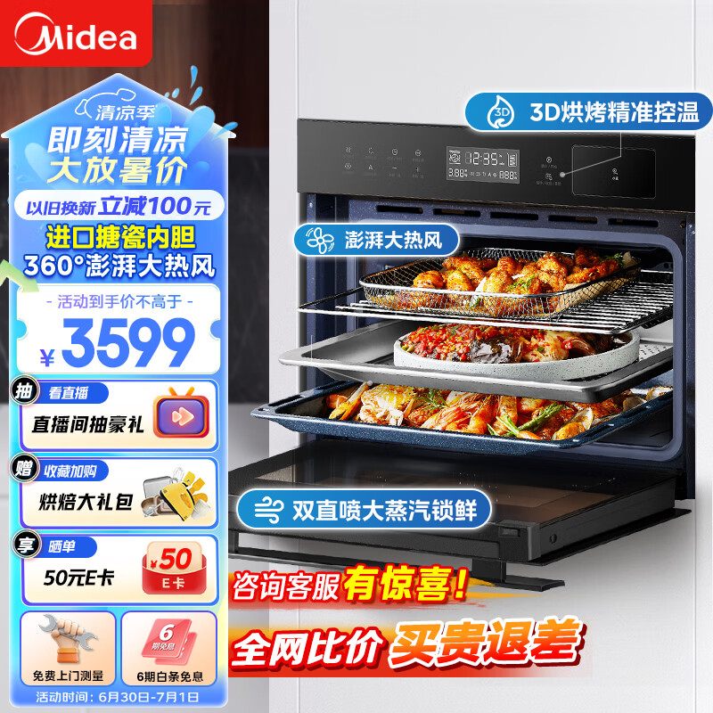 美的(Midea)蒸烤箱一体机嵌入式家用蒸烤箱55L大容量蒸烤一体机 APP智控搪瓷内胆蒸箱烤箱蒸烤炸三合一BS5053W价格:3599.00元!