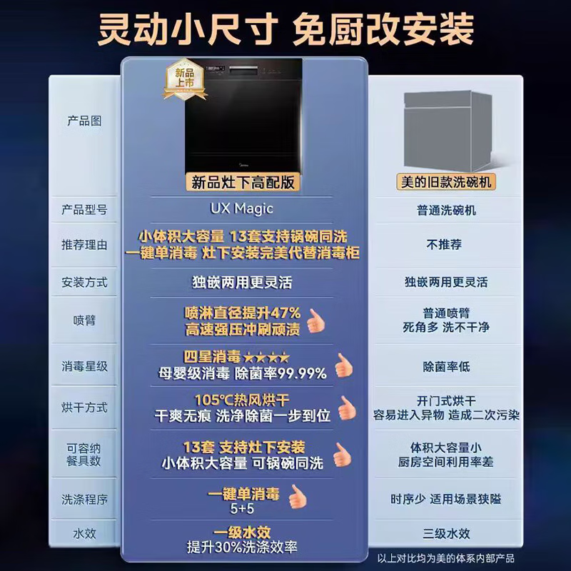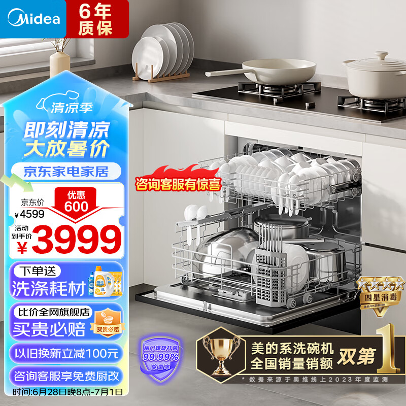 美的(Midea)小魔方洗碗机嵌入式台式家用灶下13套105℃热风烘干一级水效一键单消毒UV灭菌洗消一体机UX Magic价格:3999.00元!