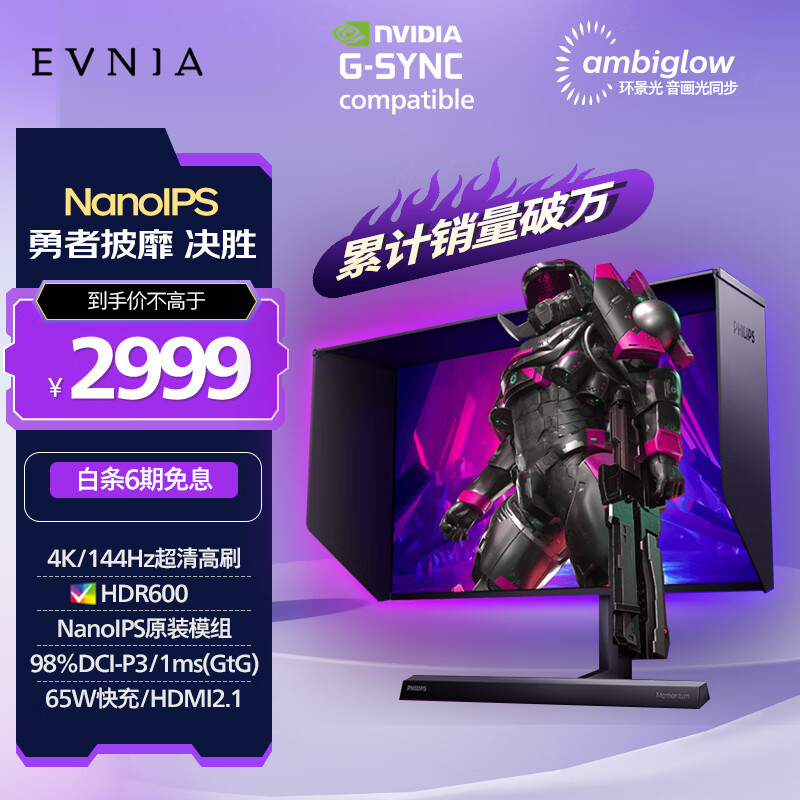 飞利浦27英寸NanoIPS出厂校准4K144Hz 1ms环景光HDR600 TypeC HDMI2.1电竞显示器DTS音效红点奖279M1RVE价格:2999.00元!