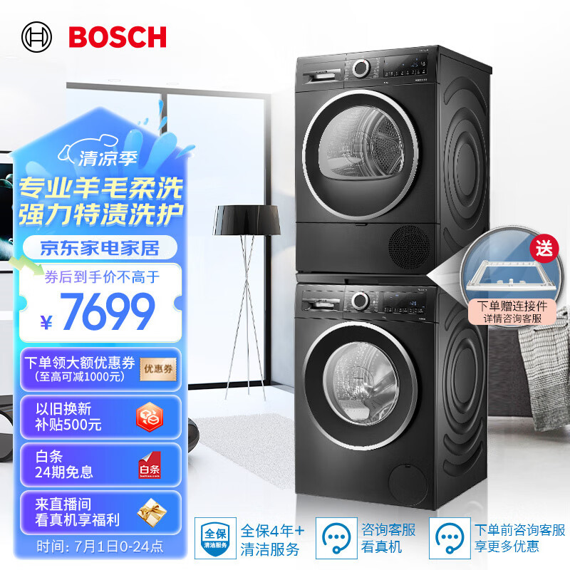 博世(BOSCH)洗烘套装10+10KG【珍珠黑】大容量全自动滚筒洗衣机家用烘干机专业羊毛柔洗特渍洗护152U2A+252U2A价格:8539.00元!