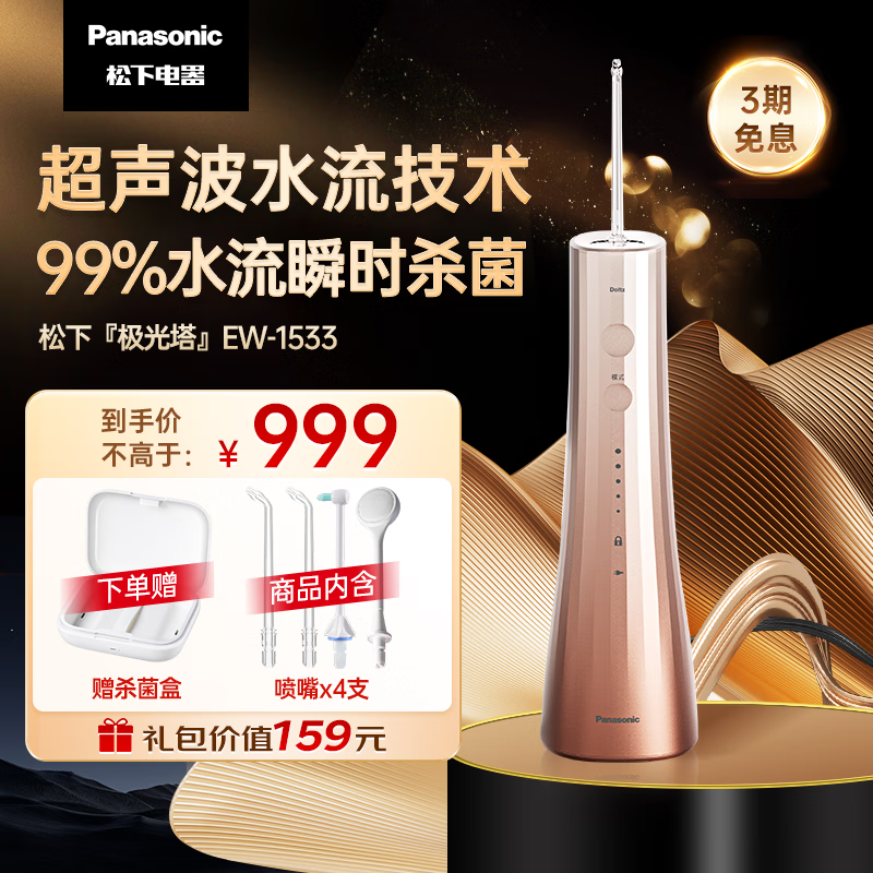 松下(Panasonic)冲牙器洗牙器水牙线超声波洁牙便携式 水流瞬时杀菌 父亲节礼物送男士送爸爸送老公极光塔1533 金价格:999.00元!