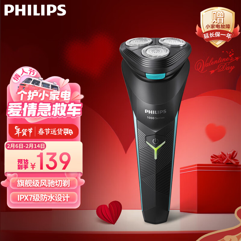 飞利浦(PHILIPS)电动剃须刀新1系 小旋风刮胡刀 新年礼物 情人节礼物 送男友 送老公价格:139.00元!