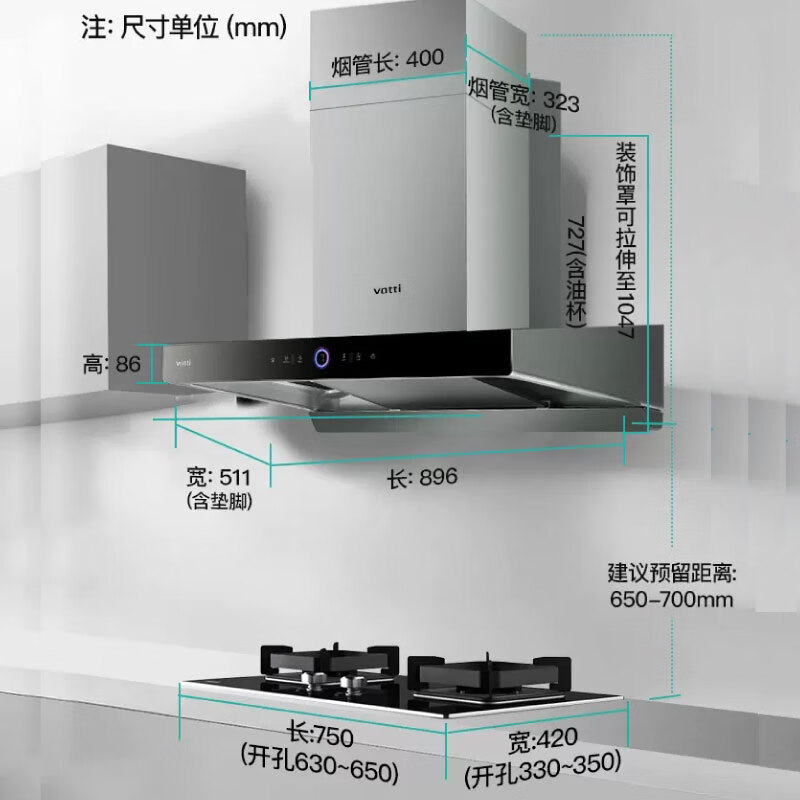 烟机安装尺寸:900±50mm