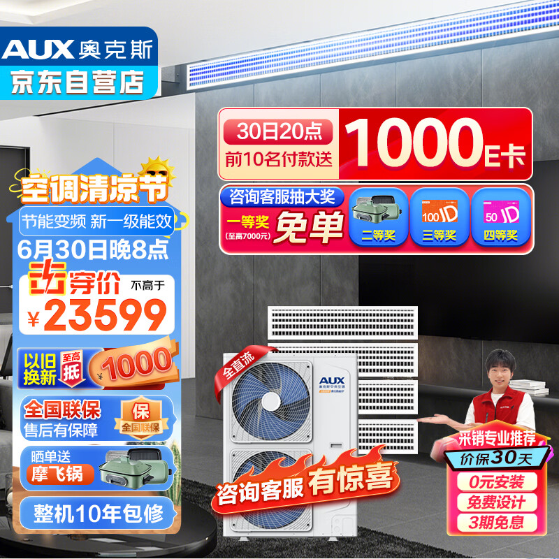 奥克斯(AUX)中央空调一拖四风管机空调6匹三室一厅家用多联机全直流变频一级能效嵌入式空调DLR-140W/DCJ2S-JM价格:23599.00元!