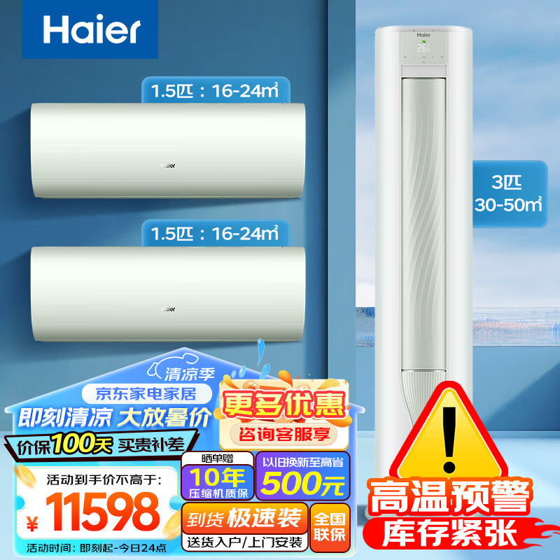 海尔(Haier)劲爽除醛版 空调套装两室一厅新一级能效变频空调家用APP智控自清洁(1.5匹挂机*2+3匹立式柜机)价格:11398.00元!
