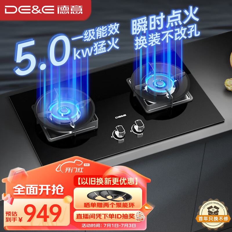 德意(DE&E)燃气灶 天然气 钢化玻璃 双眼灶具 5.0kW大火力 高热效率 全尺寸适配嵌入式灶具 716A价格:949.00元!