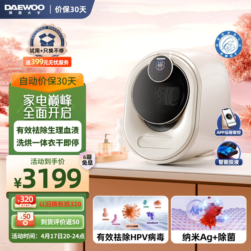 大宇(DAEWOO)内衣洗衣机 全自动洗烘一体机 1kg滚筒洗衣机 内衣裤清洗机 除HPV血渍 魔焕师 DY-MW10HW 皎月白价格:3299.00元!