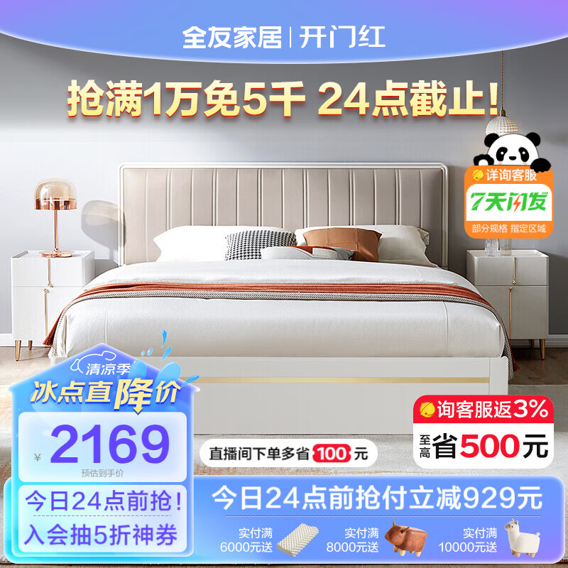 全友家居 现代简约皮艺软包主卧室轻奢双人大床1.8x2米落地婚床127702价格:3098.57元!