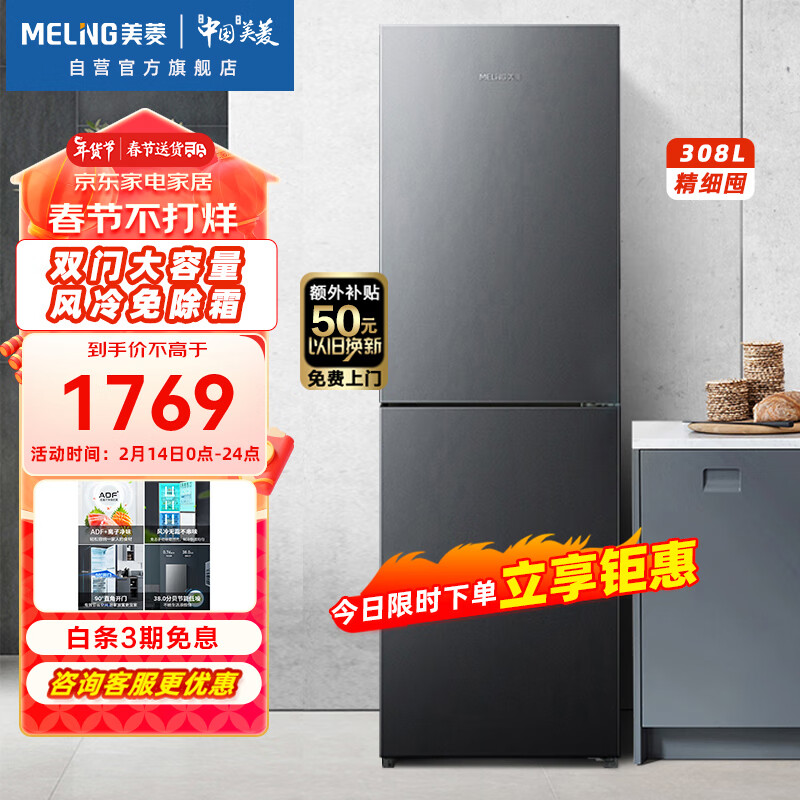 美菱(MELING)【离子净系列】308升双门两门小型电冰箱 家用风冷无霜节能低噪净味大容量 BCD-308WECX价格:1689.00元!