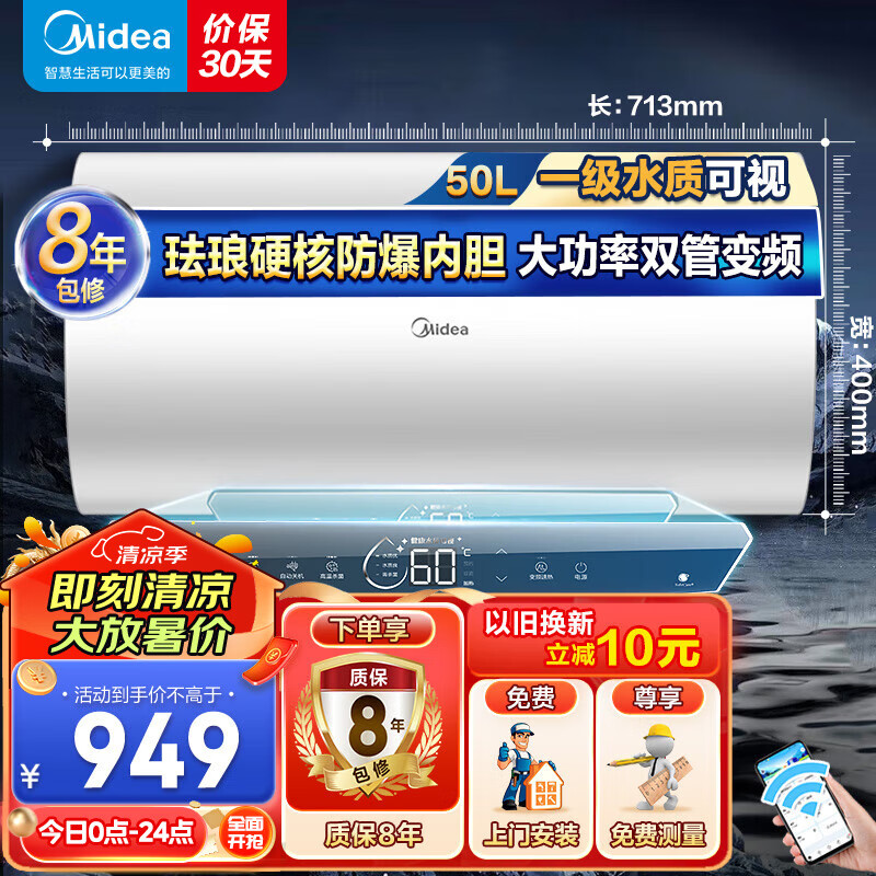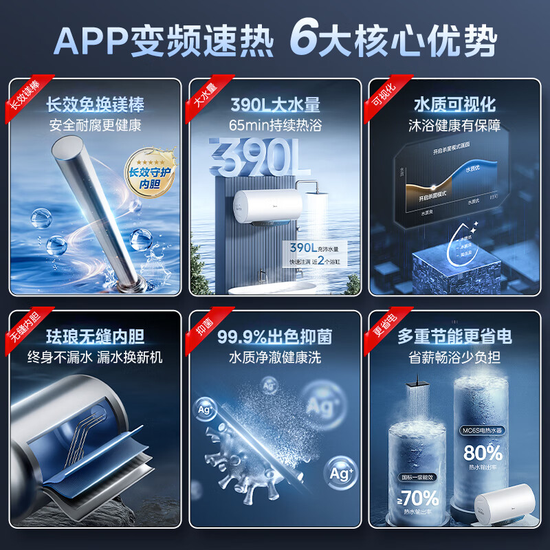 美的(Midea)50升储水式电热水器3200W一级能效变频速热增容智能省电家用卫生间健康洗电热水器F5032-MC6S(HE)价格:949.00元!