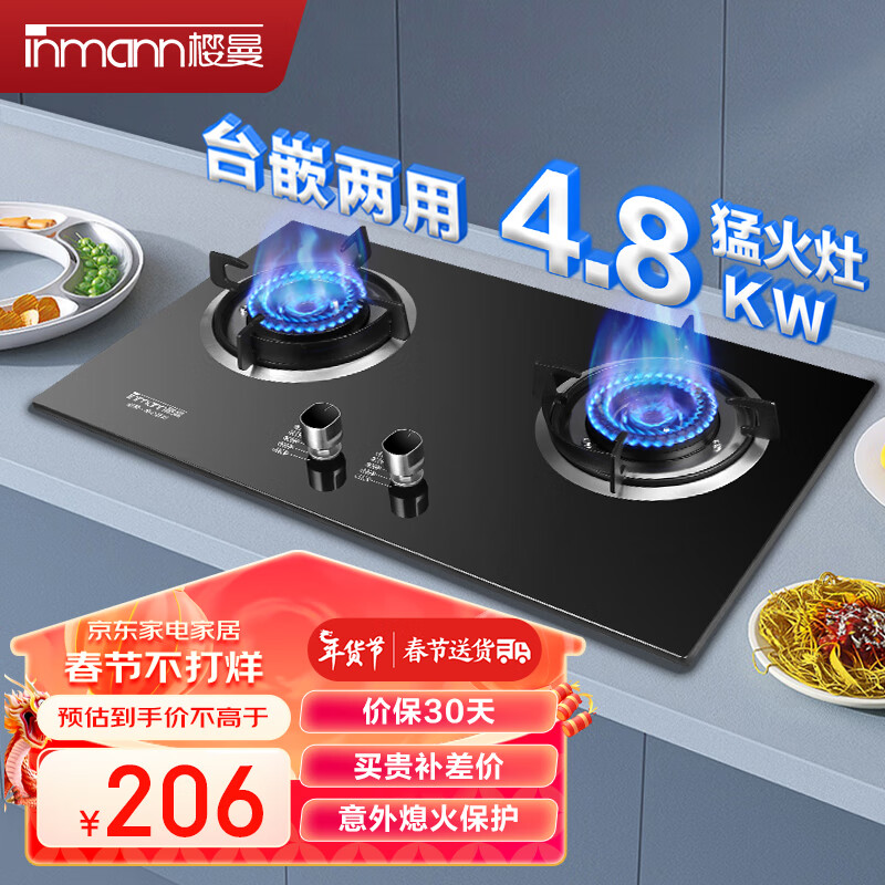 樱曼 燃气灶 煤气灶 双灶 家用台式/嵌入式 一级能效4.8KW 猛火爆炒钢化玻璃炉 JZT-G108(天然气)价格:206.00元!