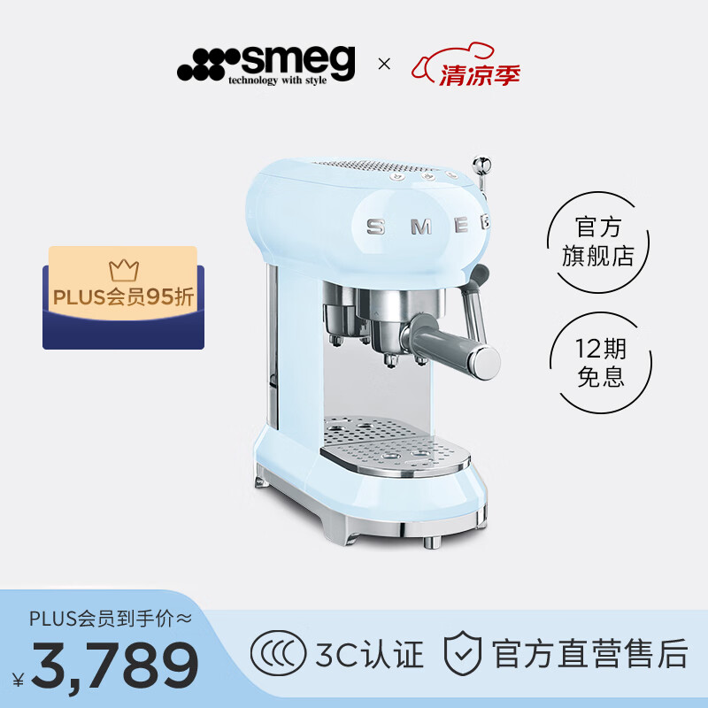 SMEG斯麦格 意大利半自动咖啡机 家用小型蒸汽奶泡 意式浓缩小型咖啡机ECF01 生日礼物 粉蓝色价格:2749.00元!