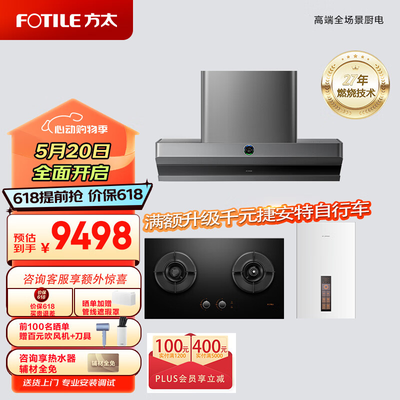 方太(FOTILE)家用厨房烟灶热三件套 24风量顶侧一体烟机 5.2kW防干烧燃气灶 17升热水器F2.I+THK21B+X16F1价格:10498.00元!