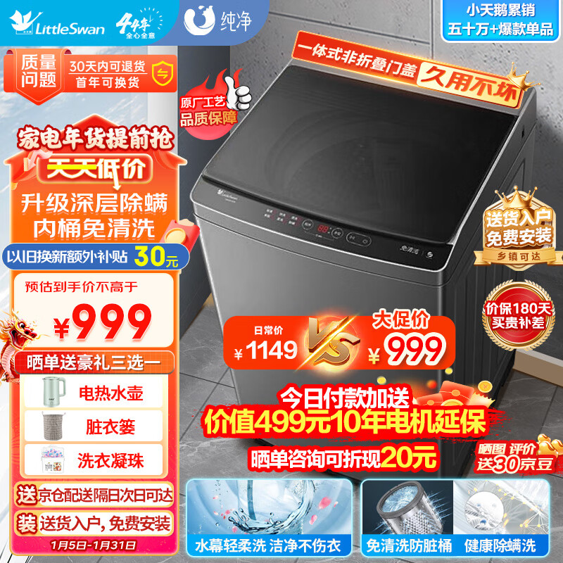 小天鹅(LittleSwan)波轮洗衣机全自动10公斤大容量除螨纳米除菌以旧换新健康免清洗防缠绕洗衣机 10KG纯净波轮【深层除螨】TB100V23H-1价格:999.00元!