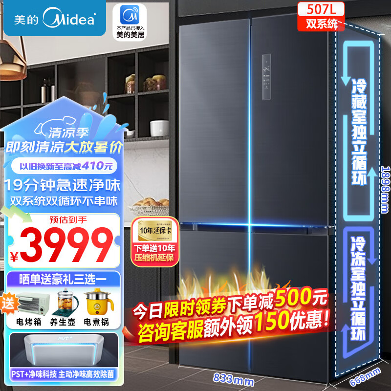 美的(Midea)507升双系统十字对开门冰箱一级能效变频 除菌净味 19分钟净味 四门风冷电冰箱BCD-507WTPZM(E)价格:4497.00元!