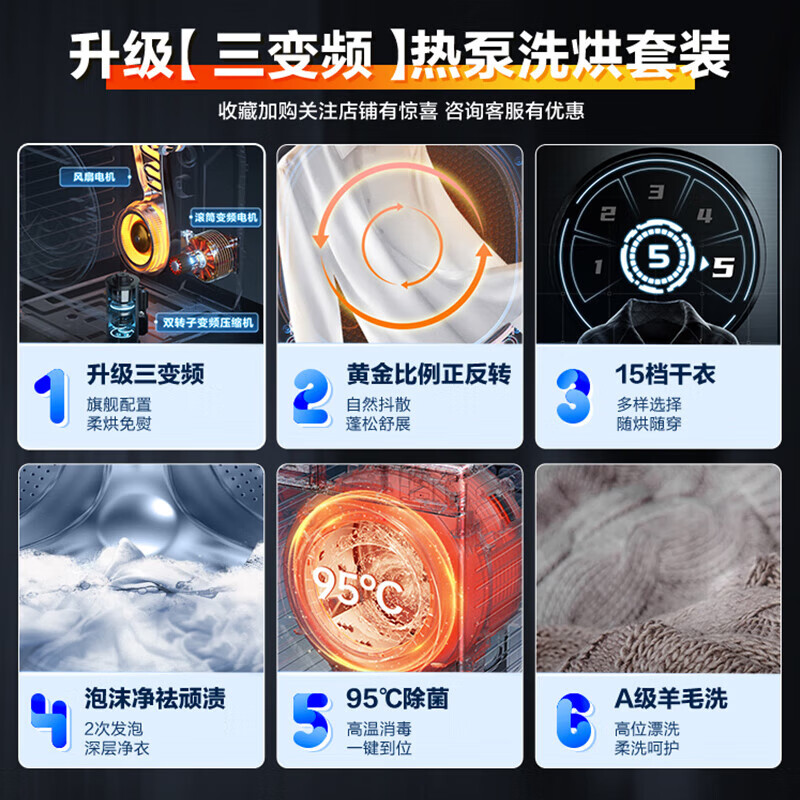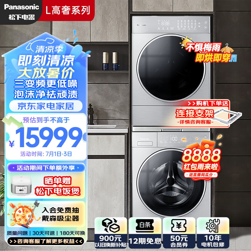 松下(Panasonic)轻奢升级三变频洗烘套装 10kg全自动滚筒洗衣机+10kg热泵烘干机家用 除皱 护色除菌 L165+LHM02Y2价格:17769.00元!