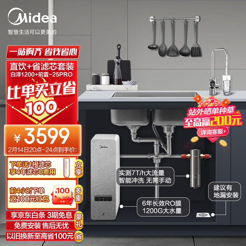 美的(Midea)省芯直饮净水器套装【白泽1200G+前置过滤器-25pro】厨下式智能水龙头 RO反渗透家用一体净饮机价格:3799.00元!