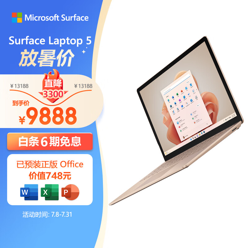 微软Surface Laptop 5 轻薄办公笔记本电脑 i7 16G+512G 砂岩金 Evo认证 13.5英寸 2.2K高色域触控屏价格:9888.00元!