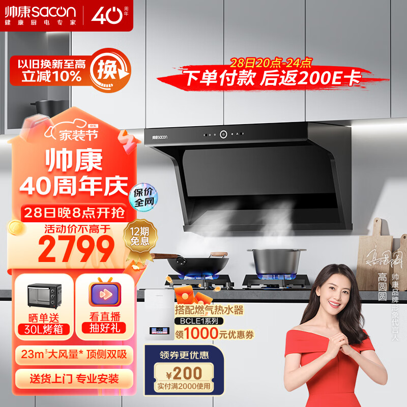 帅康(Sacon)抽油烟机顶侧双吸油烟机 家用23大风量7字机 挥手智控 自动清洗 Y8272+E8T01F液化气价格:2799.00元!