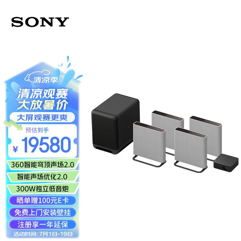索尼(SONY)HT-A9M2+SW5 Quad 低音旗舰套装 360智能穹顶 4K120 VRR ALLM 家庭影院 回音壁 电视音响 蓝牙价格:19580.00元!