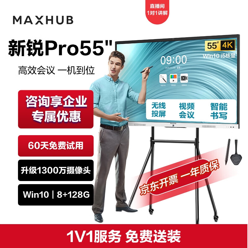 maxhub会议平板新锐Pro55英寸触摸视频会议电视一体机 投屏电视智慧屏SC55 i5+时尚支架+传屏+笔商用显示价格:9299.00元!