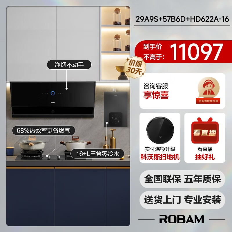 老板(Robam)厨房多件套抽油烟机灵犀全自动侧吸变频26风量燃气灶具燃气热水器天然气29A9S+57B6DT+HD622A-16价格:11097.00元!