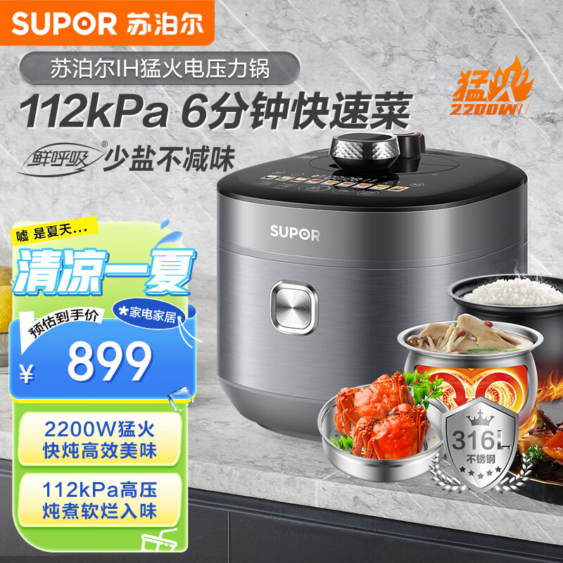 苏泊尔(SUPOR)IH鲜呼吸猛火电锅5L智能预约112kPa电饭煲高压锅 6min速菜 316L钢釜蒸笼球釜双胆SY-50HC8015Q价格:899.00元!