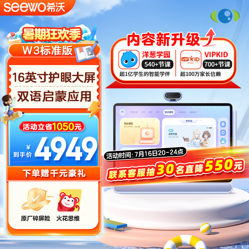 希沃学习机W3类纸护眼大屏儿童学习机学生平板电脑小学到高中课程同步AI英语学习早教机8G+256G 星辰紫价格:4999.00元!