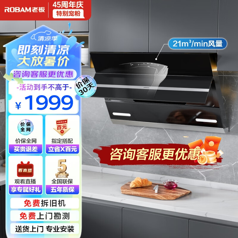 老板(Robam)吸油烟机侧吸式油烟机家用21风量 内腔免拆洗挥手智控抽脱排油烟机27A3H烟机价格:2499.00元!
