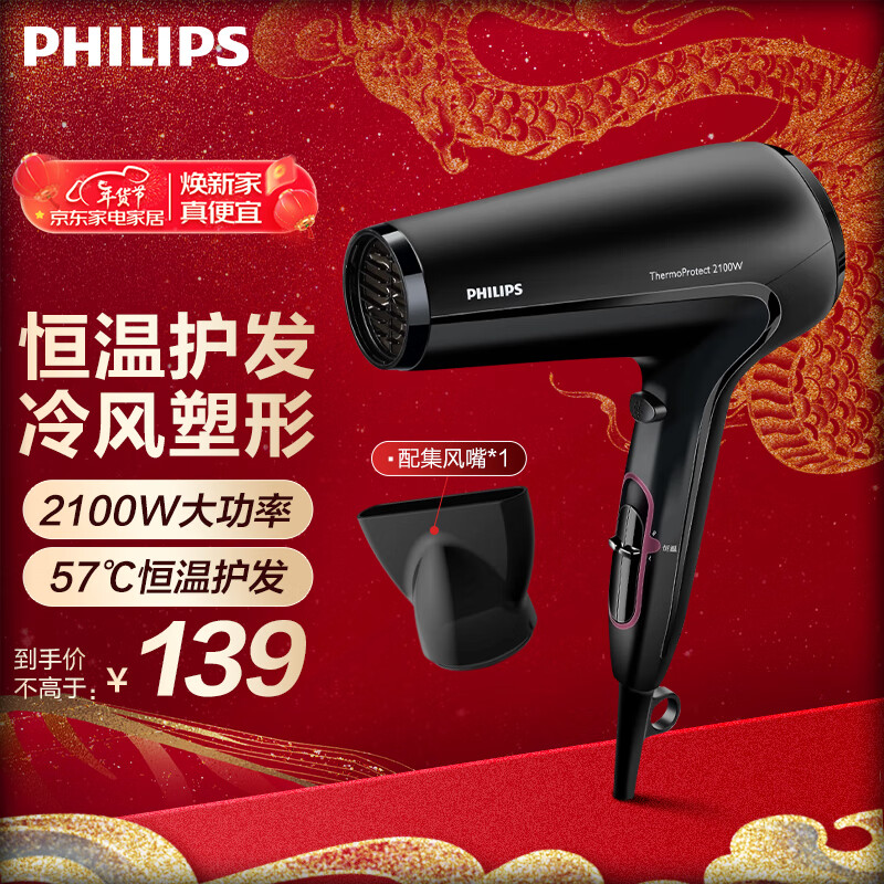 飞利浦(PHILIPS)电吹风机 家用大功率 6档调控 恒温速干 发廊沙龙专业级吹风筒 2100W丨恒温护发丨黑色价格:209.00元!
