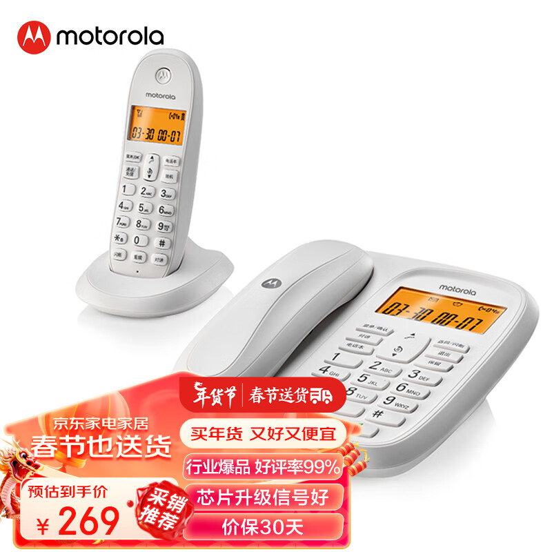 摩托罗拉(Motorola)数字无绳电话机 无线座机 子母机一拖一 办公家用 中文显示 双免提套装CL101C(白色)价格:269.00元!