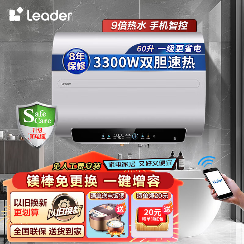 海尔(Haier)扁桶电热水器60升家用双内胆3300W增容速热储水式洗澡上门安装防电墙节能净水洗价格:1879.00元!