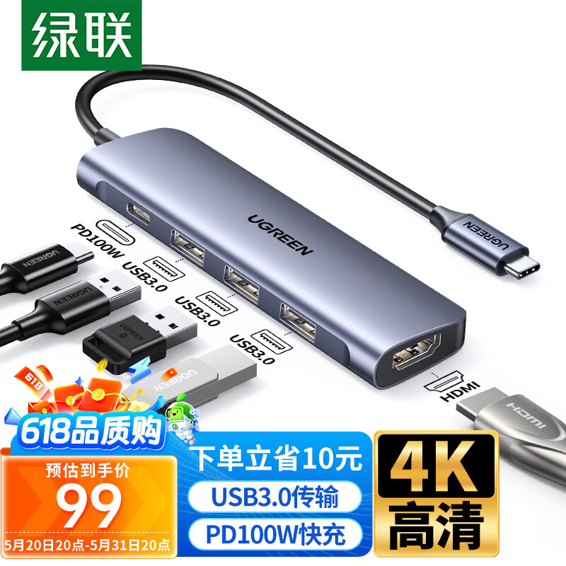 绿联Type-C扩展坞雷电4转HDMI拓展坞USB分线器多接口转接头通用苹果15MacBookair华为笔记本电脑转换器价格:99.00元!