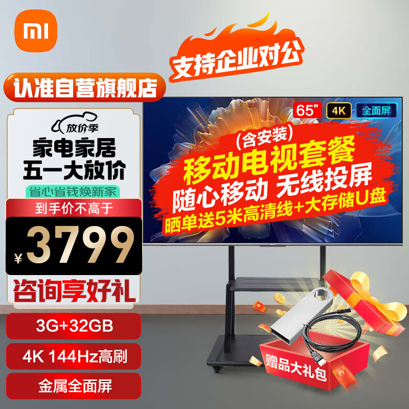 小米(MI)电视S65 65英寸4K 144Hz超高刷游戏电视 WiFi 6 3GB+32GB屏智能电视L65M9-S[移动支架安装]价格:3799.00元!