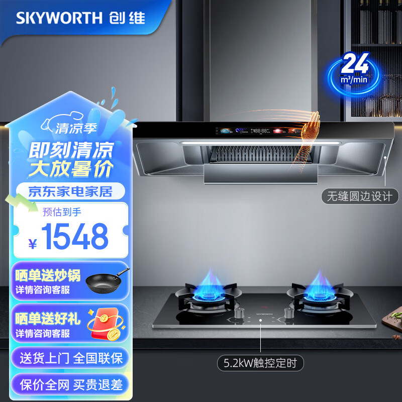 创维(Skyworth)抽油烟机灶具套装家用24风量排油烟机燃气灶套餐烟灶套装 智能彩屏AI声控Y009+Z200天然气价格:1598.00元!
