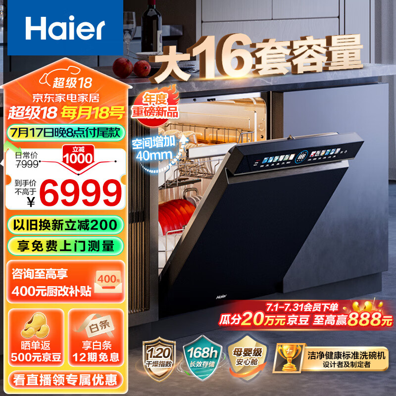 海尔(Haier)双面洗嵌入式健康洗碗机W5000Max 升级大16套 变频分区洗 新一级水效 7天存储EYBW163266GHU1价格:6999.00元!