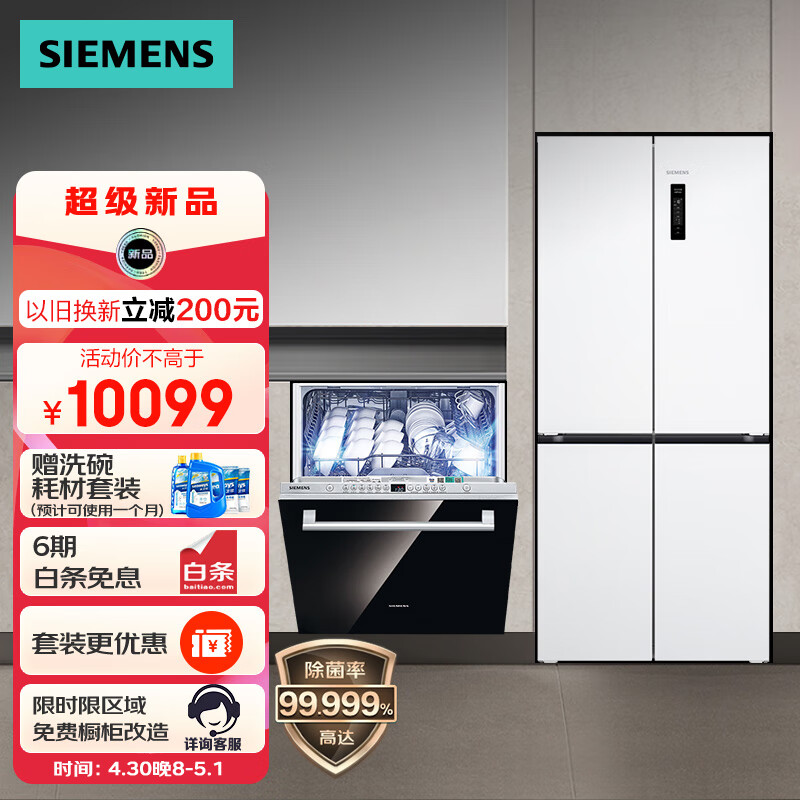 西门子14套嵌入式家用洗碗机 497升超薄微平嵌四开门冰箱组合套装SJ436B88QC(含黑门板)+KC502080EC价格:10099.00元!